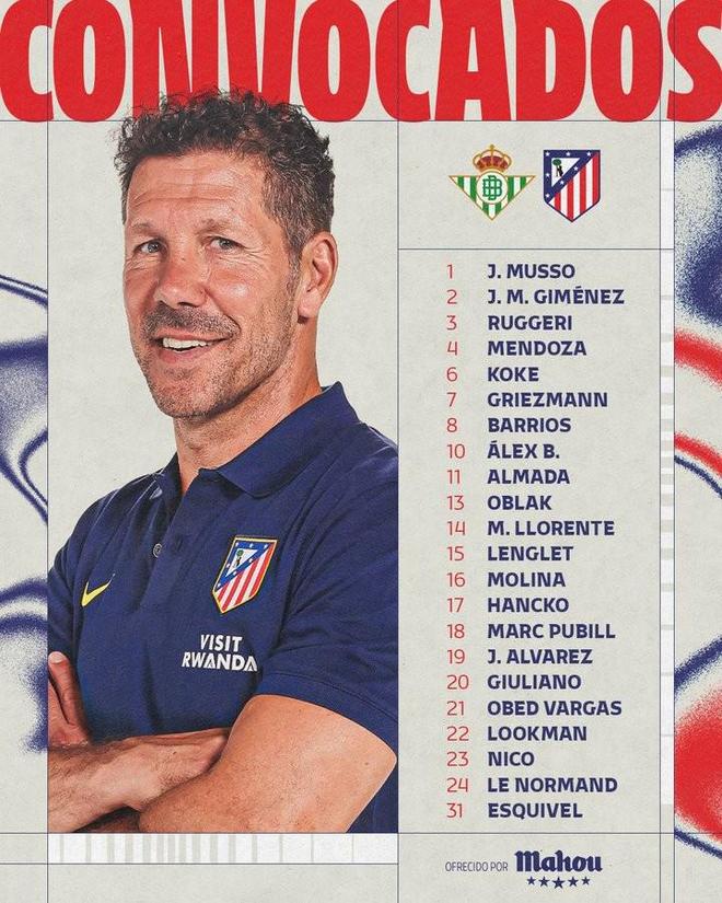 马竞客战贝蒂斯名单:格子回归,瑟洛特伤缺,3名新援均在列