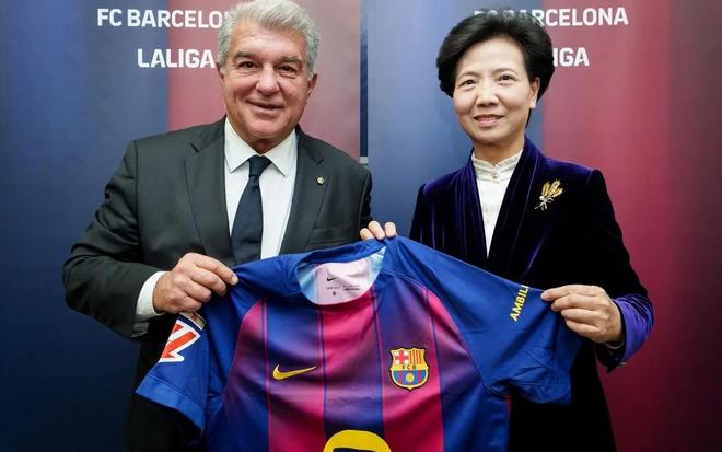 巴塞罗那足球俱乐部主席拉波尔塔与西甲联盟主席特巴斯,共同欢迎由中国国务委员谌贻琴率领的中国代表团访问巴萨拉玛西亚青训营。